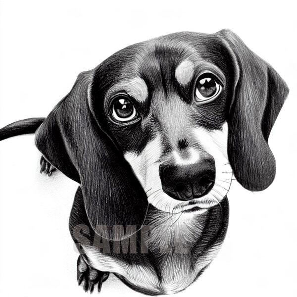 AI生成画像で制作された犬のダックスフンドのペンシル画、 #009964 。驚くほどリアルな描写力で、まるで生きて動いているような迫力のある作品です。ペットショップや愛犬家の間でも大変人気があります。